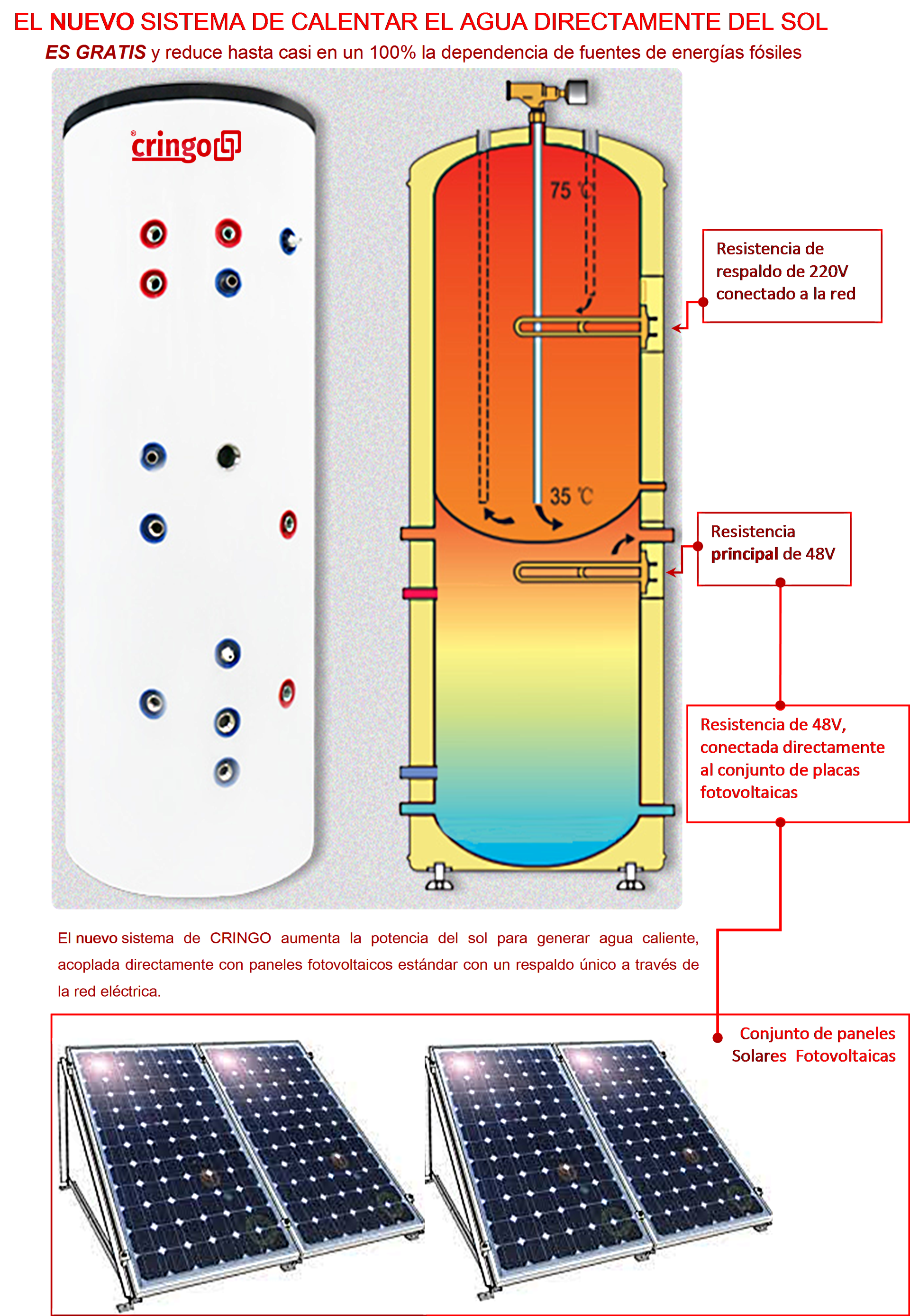 Lo scaldacqua elettrico ibrido CRINGO, certificato ISO9001 e CE, offre un NUOVO concetto di applicazione per l'accumulo di acqua calda commerciale e domestica. Questo è il NUOVO scaldacqua solare, che utilizza pannelli solari fotovoltaici standard per la sua alimentazione.